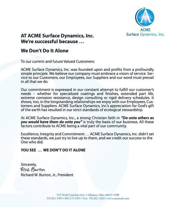 “At ACME we believe in the Golden Rule. We treat every customer, supplier and employee as we would like to be treated. This translates into a commitment to excellence that is unsurpassed in our industry. We serve our customers the same way we serve our Creator, with great vigor, without compromise and with all that is within us.”